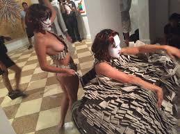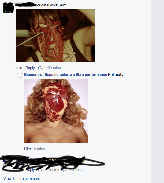 Perhaps she is using the meat mask to hide from something? Maybe it stems from an insecurity in her art practice? A lack of material? Maybe she felt that since she is performing in another country that it’s ok to copy another artists work because it will go unnoticed? Or perhaps it is a critique? I can only speculate.