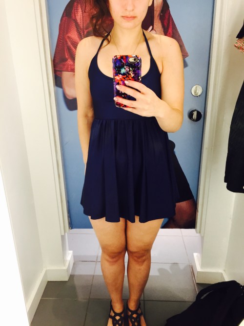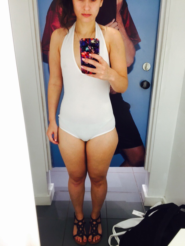 I picked out a white body suit in XS, S and M. The XS was very small and it split my butt checks into two so I had my butt and a mini but below it. Surely this didn’t work. The S had the same issue but it wasn’t very noticeable. This part of the costume would be draped in tulle anyway. The material was very sheer and my belly button and nipples were very obvious. I tried on some other sale items but mostly felt like a slutty sausage.