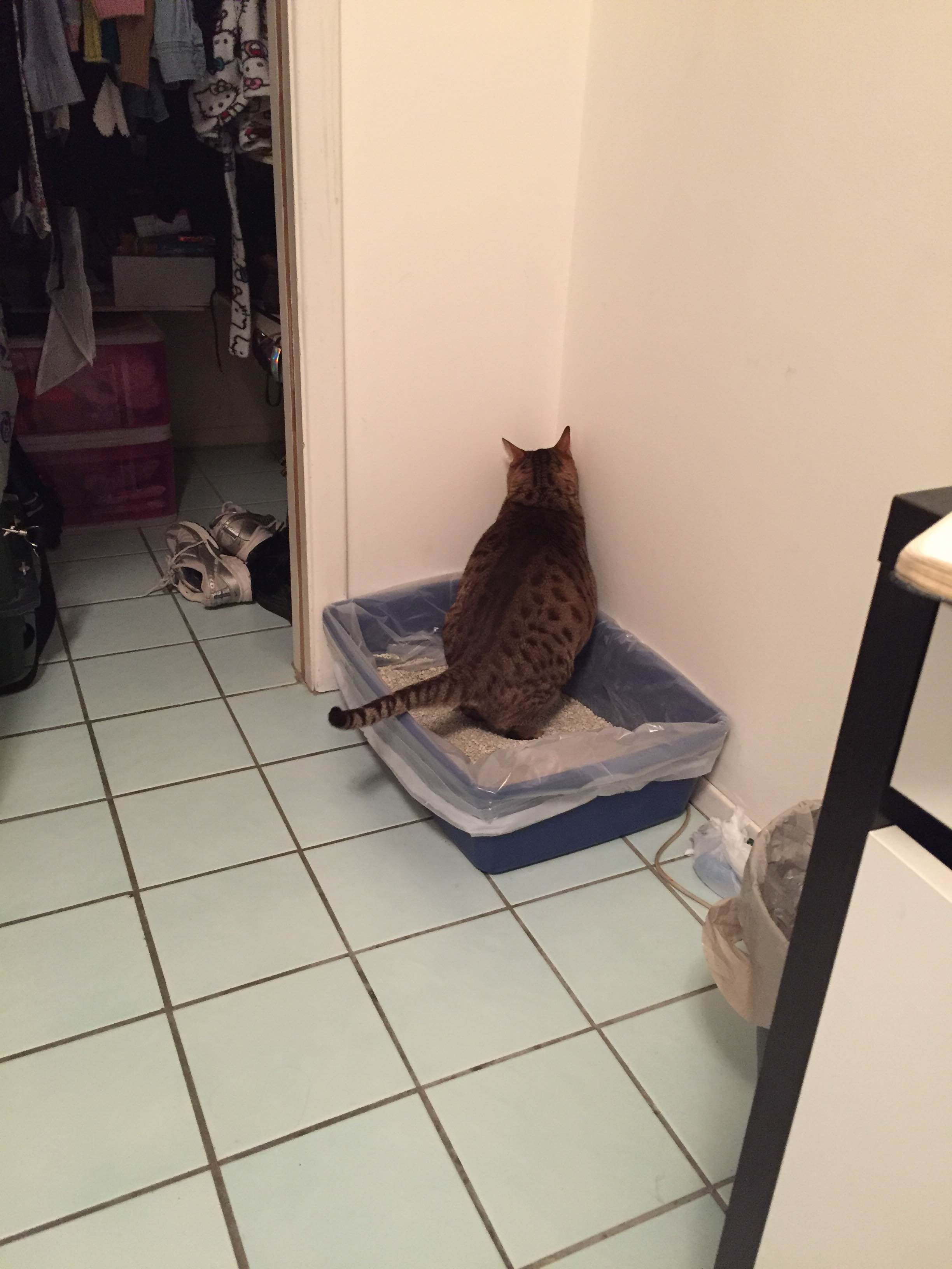 The cat I am babysitting broke my favorite necklace. I touched his belly so he swatted at my face. He became latched on the necklace and broke the chain. He promptly went to his litter box and forced out a huge smelly shit. He strained so hard that you could hear faint cries as he pushed.