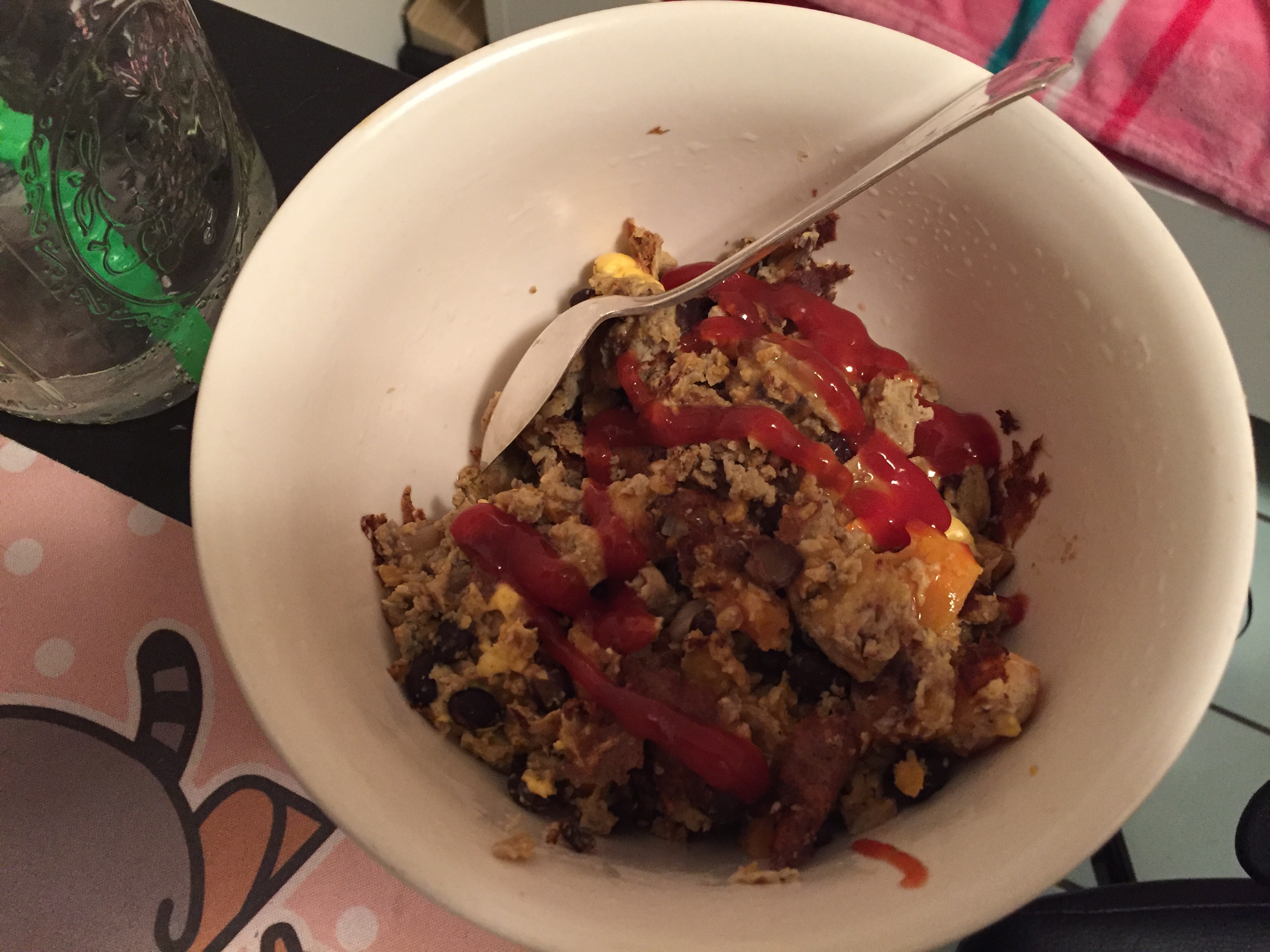 I made myself a pretty disgusting and ugly birthday dinner. Two scrambled eggs mixed with black beans, sweet potato and a chopped up corn cake. There might be American cheese but I don’t remember.